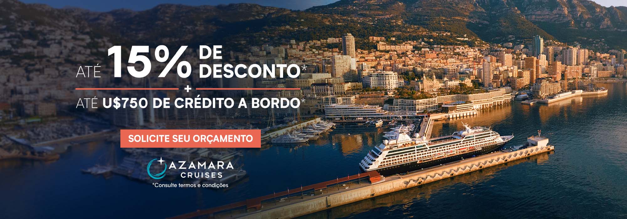Oferta: Válida para membros Azamara Circle Loyalty Program, a oferta concede 10% de descontos na tarifa do cruzeiro (não inclui taxas portuárias e de serviço).