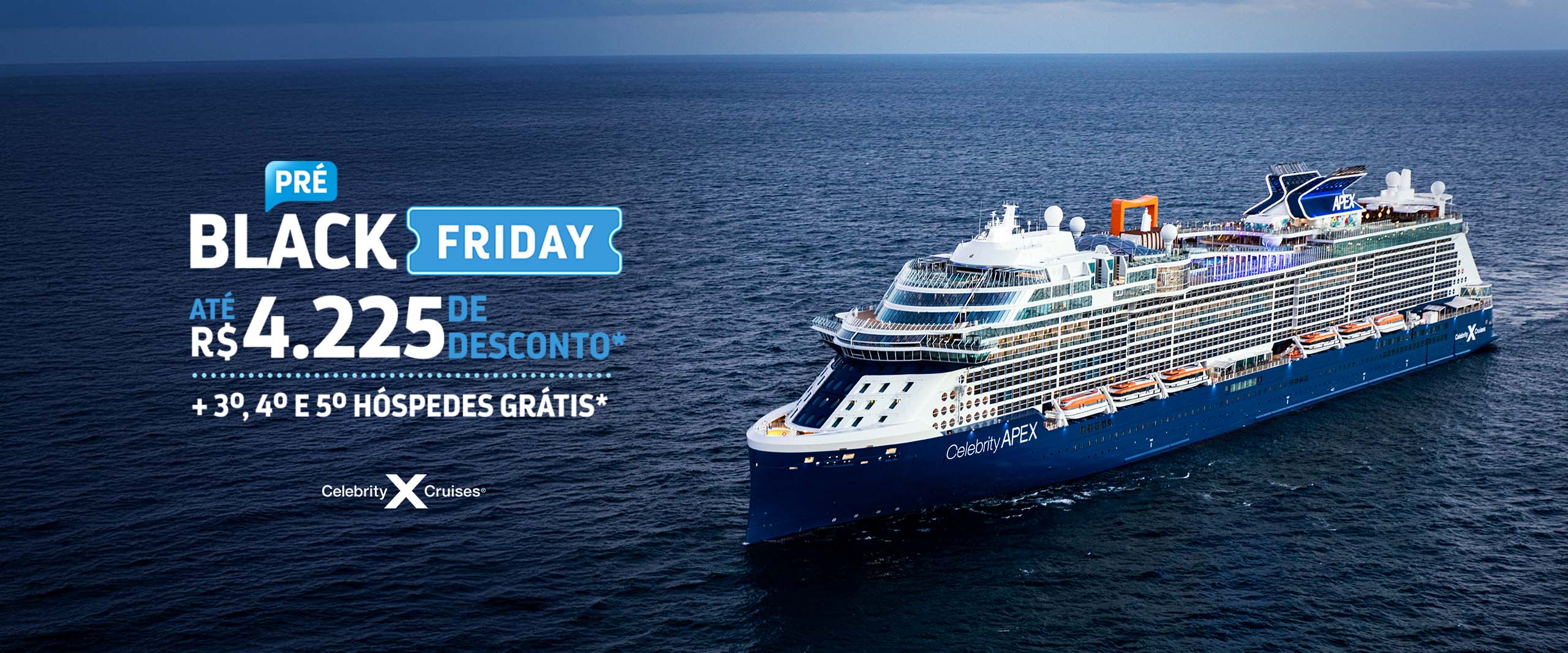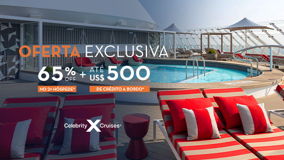 Produtos aplicáveis: Saídas selecionadas em cruzeiros a partir de 3 noites entre 07/11/2025 a 10/05/2028, exceto Celebrity River Cruises, Galápagos e Alasca Cruisetours.