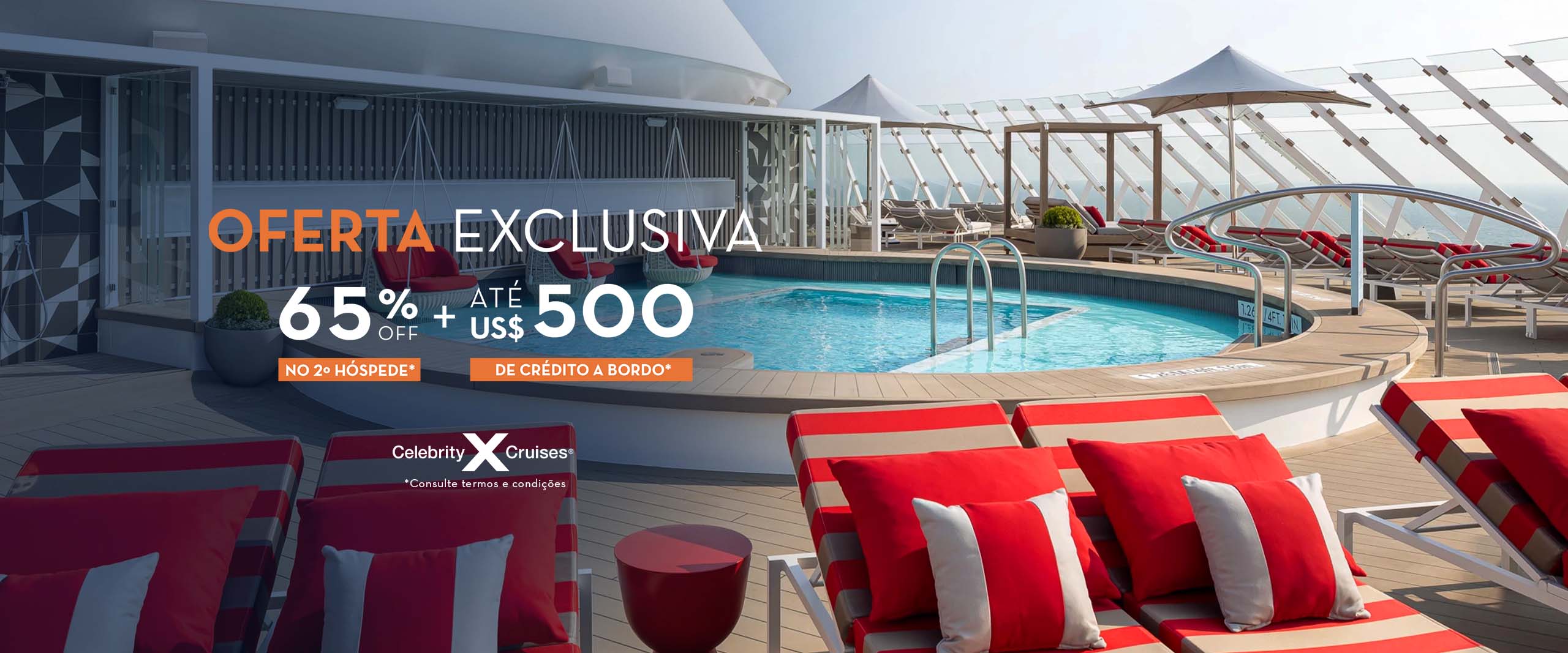 Embarques: Cruzeiros entre 07/11/2025 a 10/05/2028, exceto em saídas de Celebrity River Cruises e Galápagos. Oferta: A oferta concede até R$4.200 de desconto por cabine com base em ocupação dupla.