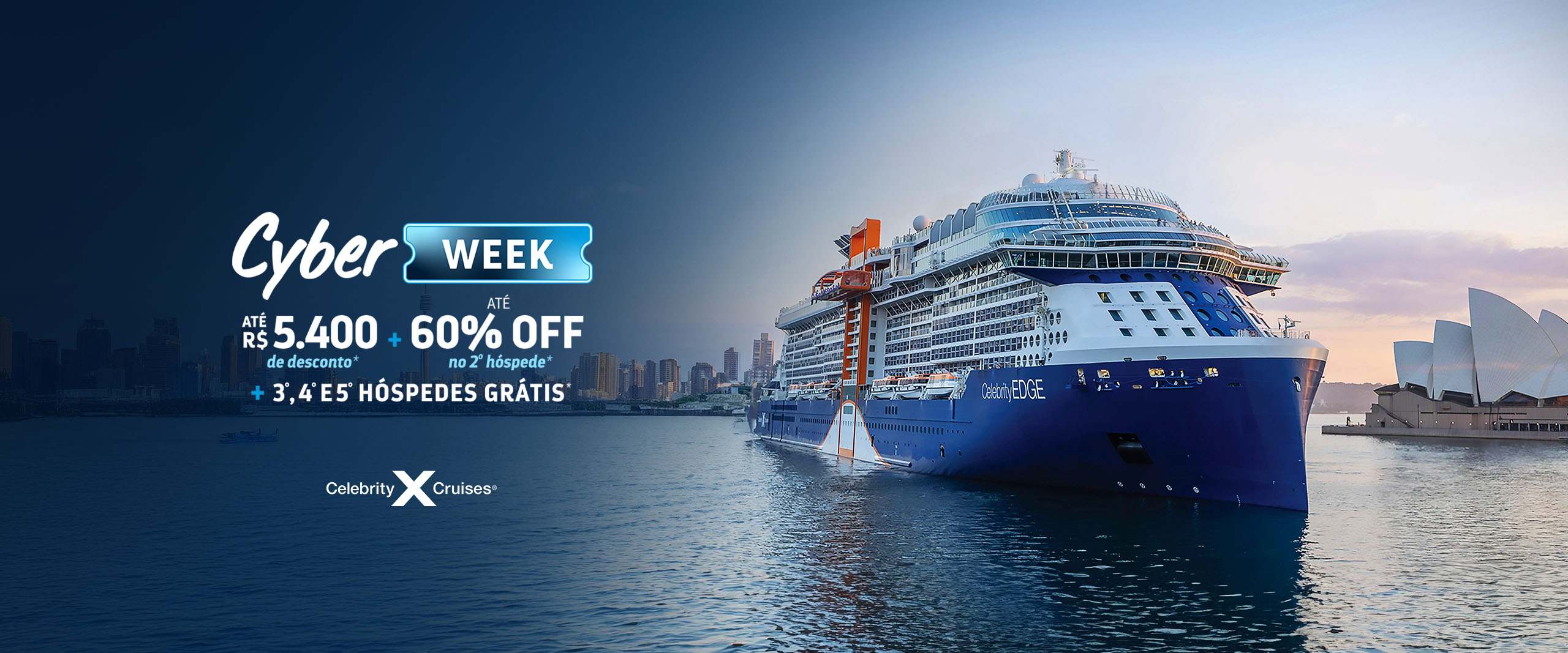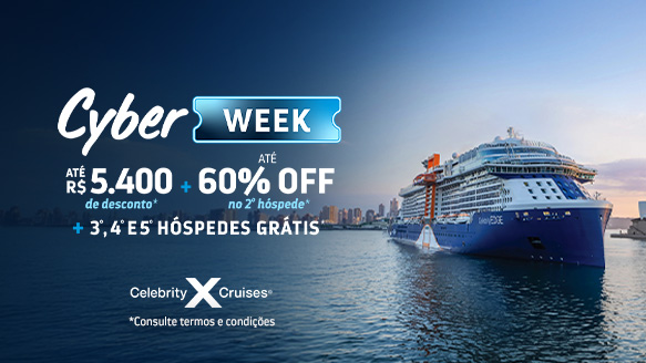 A oferta “CYBER WEEK CELEBRITY” oferece desconto de até R$ 5.400,00 por cabine com base em ocupação dupla. Em saídas de 5 noites ou menos, R$ 600,00 de descontos em cabines internas e externas vista mar, R$ 1.500,00 em varandas e R$ 2.400,00 em suítes. Em saídas de 6 noites ou mais, R$ 900,00 de descontos em cabines internas e externas vista mar, R$ 2.100,00 em varandas e até R$ 5.400,00 em suítes. Oferta válida para novas reservas individuais e de grupos efetivadas entre 03 de dezembro de 2025 e 08 de dezembro de 2025, com embarques entre 03 de dezembro de 2025 a 10 de maio de 2028, exceto saídas de Celebrity River Cruises e Galápagos.