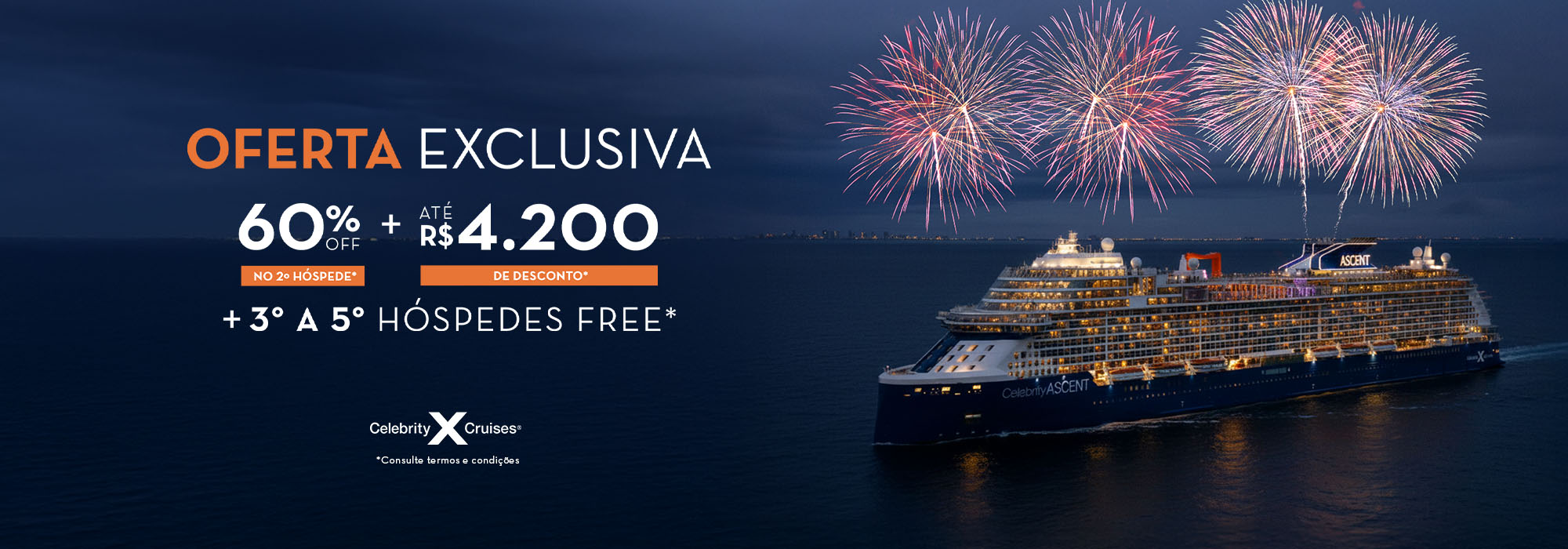 Produtos aplicáveis: Saídas selecionadas em cruzeiros a partir de 3 noites entre 09/12/2025 a 10/05/2028, exceto Celebrity River Cruises, Galápagos e Alasca Cruisetours.