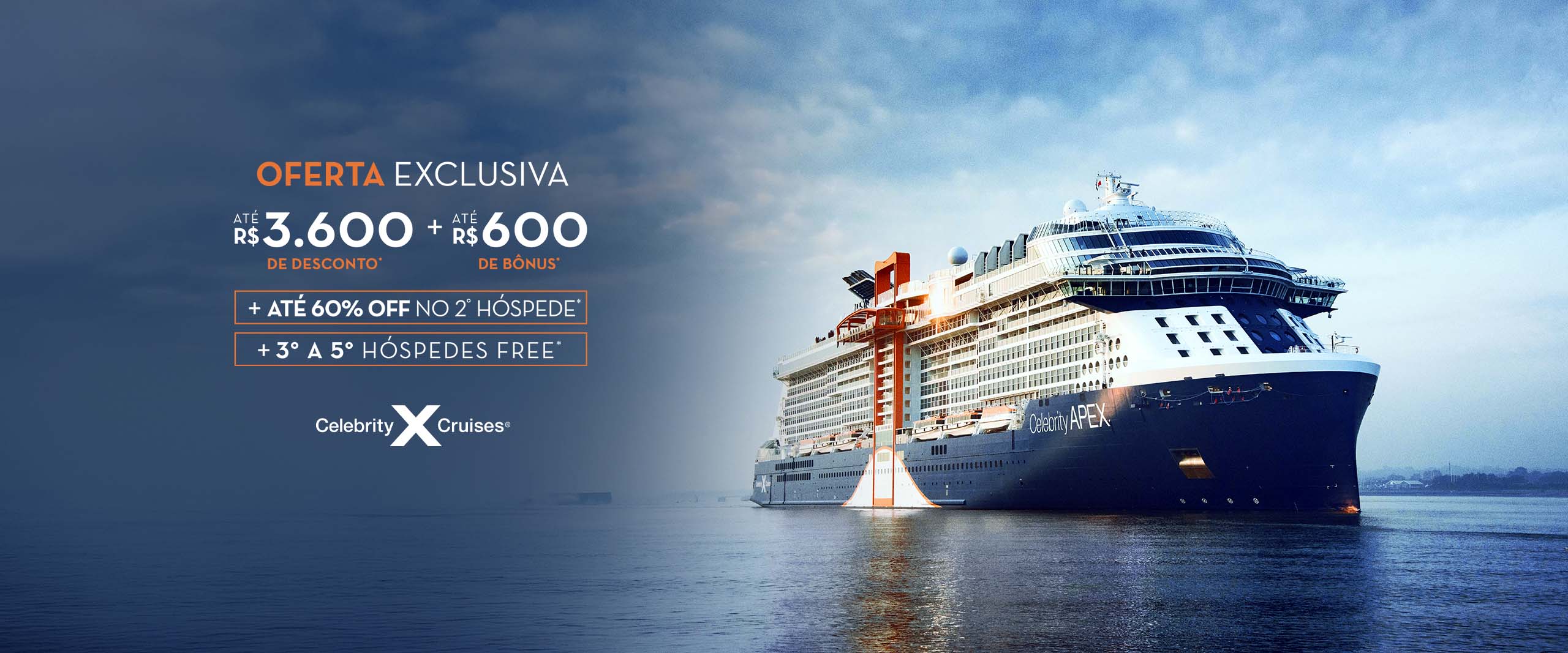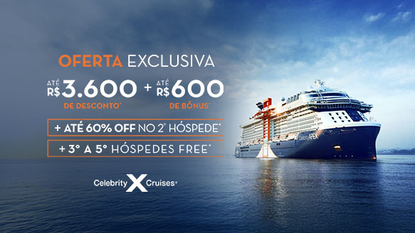 Embarques: Cruzeiros entre 03/02/2026 a 10/05/2028, exceto em saídas de Celebrity River Cruises e Galápagos. Oferta: A oferta concede até R$3.600 de desconto por cabine com base em ocupação dupla.