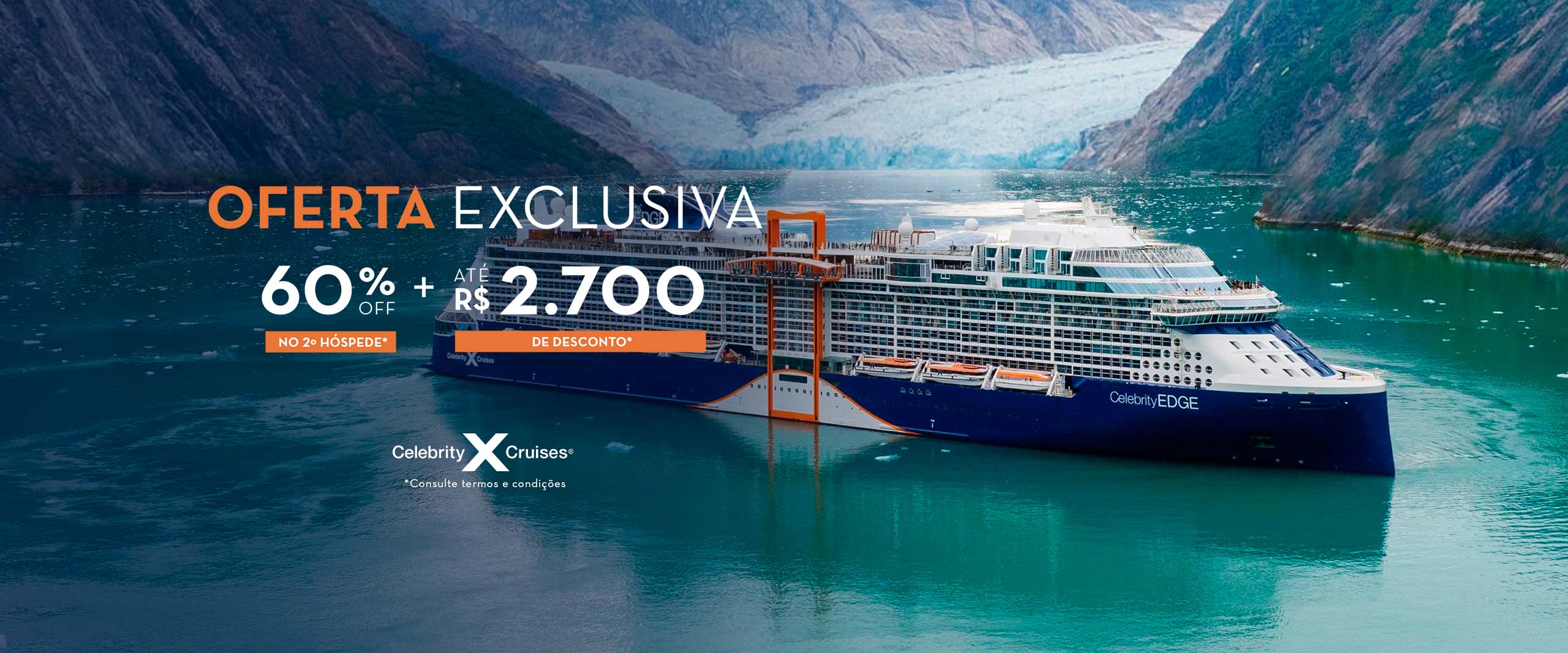 Produtos aplicáveis: Todos os cruzeiros a partir de 3 noites, exceto Celebrity River Cruises, Galápagos e Alasca Cruisetours.