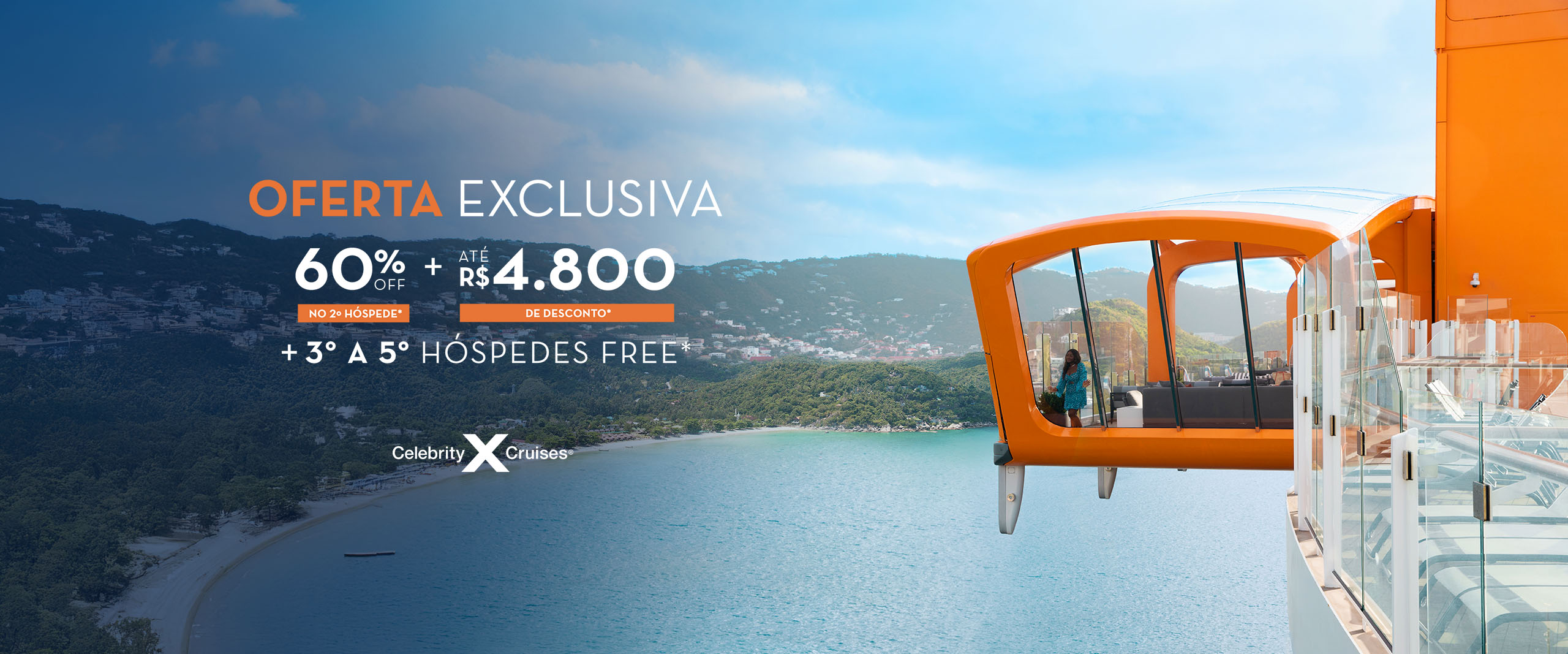Combinalidade: As ofertas “60% OFF PARA SEGUNDO HÓSPEDE EM TARIFA REGULAR (BOGO60)”, ”FIM DE SEMANA DE DESCONTOS (CARIBE)” e “SAVINGS OFFER (DESCONTO)” são combináveis com as ofertas “Tudo Incluído (All Included)” e “Tarifa sem benefícios (No Perk Rate)”. A oferta “3º, 4º e 5º HÓSPEDES FREE” é combinável com as ofertas “BOGO 60% OFF PARA SEGUNDO HÓSPEDE”, “SAVINGS OFFER (DESCONTO)” e FIM DE SEMANA DE DESCONTOS (CARIBE). A oferta “3º, 4º e 5º HÓSPEDES FREE” não é combinável com a tarifa “The Retreat”, promoção Fidelidade, tarifas Interline, Net, Travel Partner, ISO, Brochure, Exciting Deals, e Tarifas Especiais. As ofertas “60% OFF PARA O SEGUNDO HÓSPEDE (BOGO60)”, FIM DE SEMANA DE DESCONTOS (CARIBE) e “SAVINGS OFFER (DESCONTO)” não são combináveis com promoção de Fidelidade, tarifas Interline, Net, Travel Partner, ISO, Brochure, Exciting Deals, e Tarifas Especiais. A oferta “60% OFF PARA O SEGUNDO HÓSPEDE (BOGO60)” não é combinável com CruiseTours e GroupX. As combinações deverão ser efetivadas no ato da reserva na seleção de código das respectivas tarifas “Tudo Incluído (All Included)” ou “Tarifa sem benefício (No Perk)”. As ofertas não são combináveis com nenhuma outra promoção. Esta oferta está sujeita a alterações sem prévio aviso, e pode ser retirada a qualquer momento à critério da Celebrity Cruises. A oferta “LOYALTY GALAPAGOS somente é elegível ao adicionar no ato da reserva um número válido de fidelidade Captain’s Club.