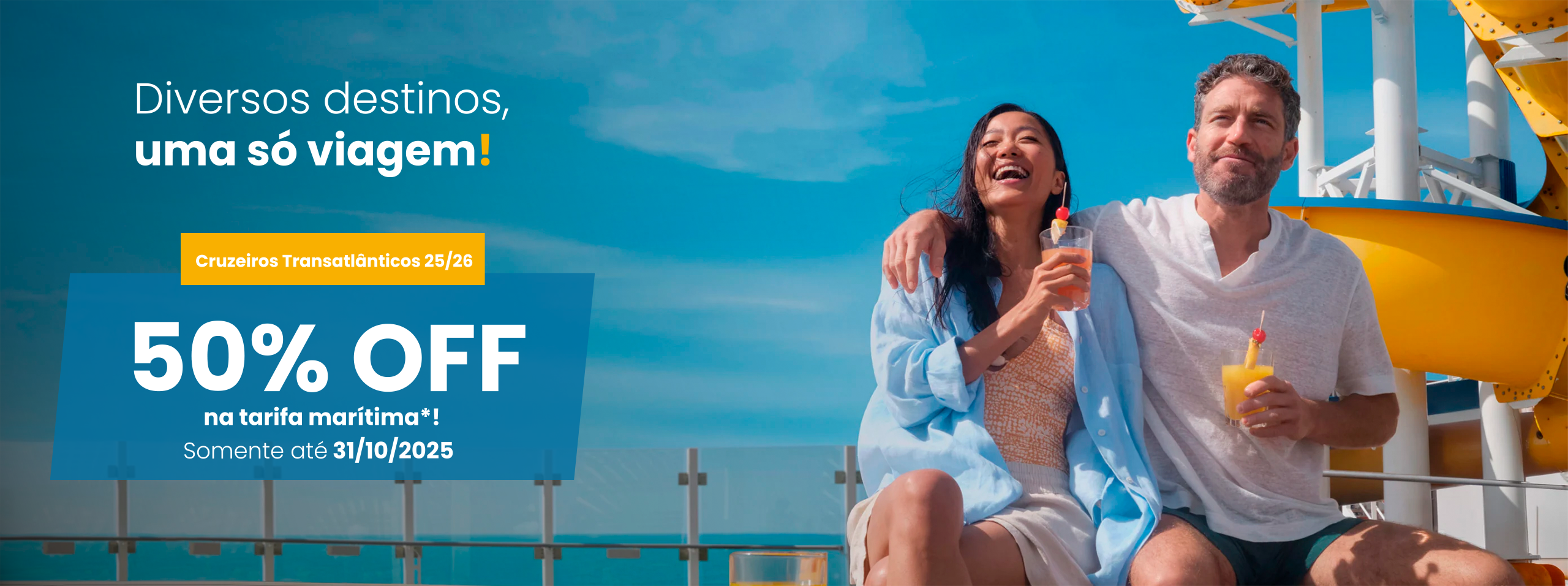 *Promoção válida de 19/05/2025 até 31/10/2025 ou limitada a 50 cabines, o que ocorrer primeiro, com a confirmação de efetivo pagamento. O desconto de 50% é aplicado na tarifa marítima (taxas de serviço e portuária, seguro viagem e pacote de bebidas não são considerados) e válido para o 1º, 2º, 3º e 4º hóspedes nas tarifas MyCruise e All Inclusive, na travessia transatlântica Europa-Brasil e Brasil-Europa a bordo dos navios Costa Diadema e Costa Favolosa. O desconto não é válido para grupos.