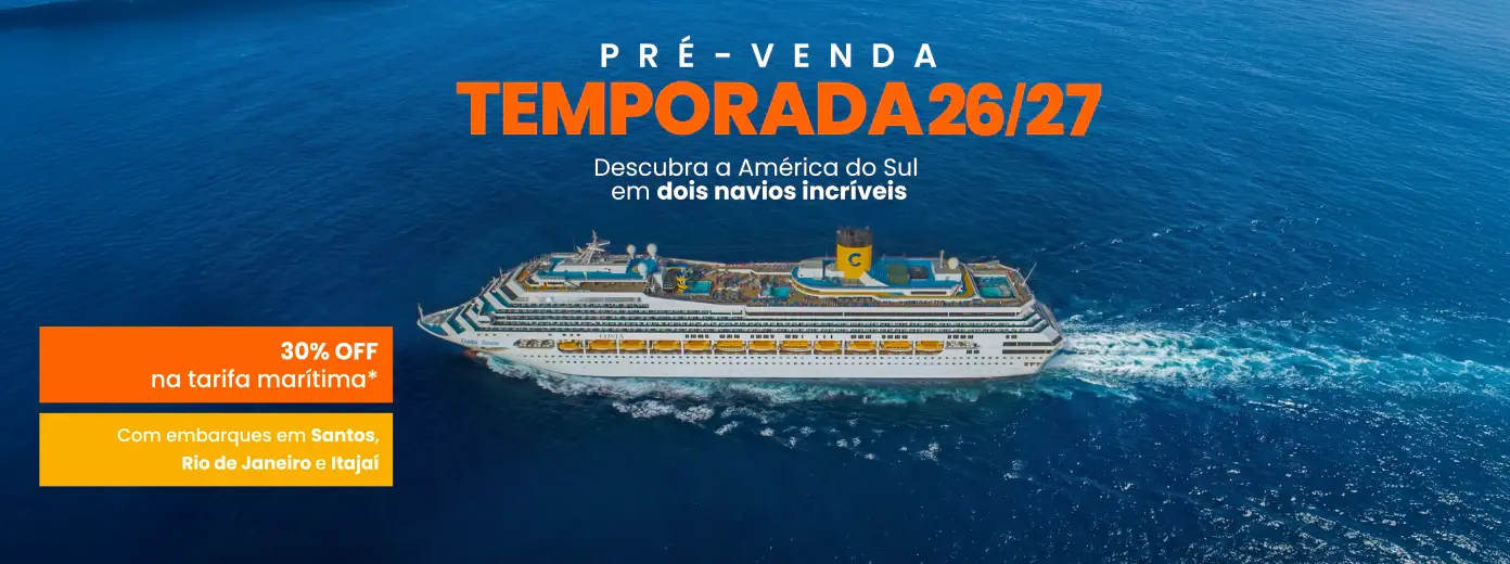Embarques: saídas selecionadas nos navios Costa Diadema e Costa Serena, na Temporada América do Sul 26/27.