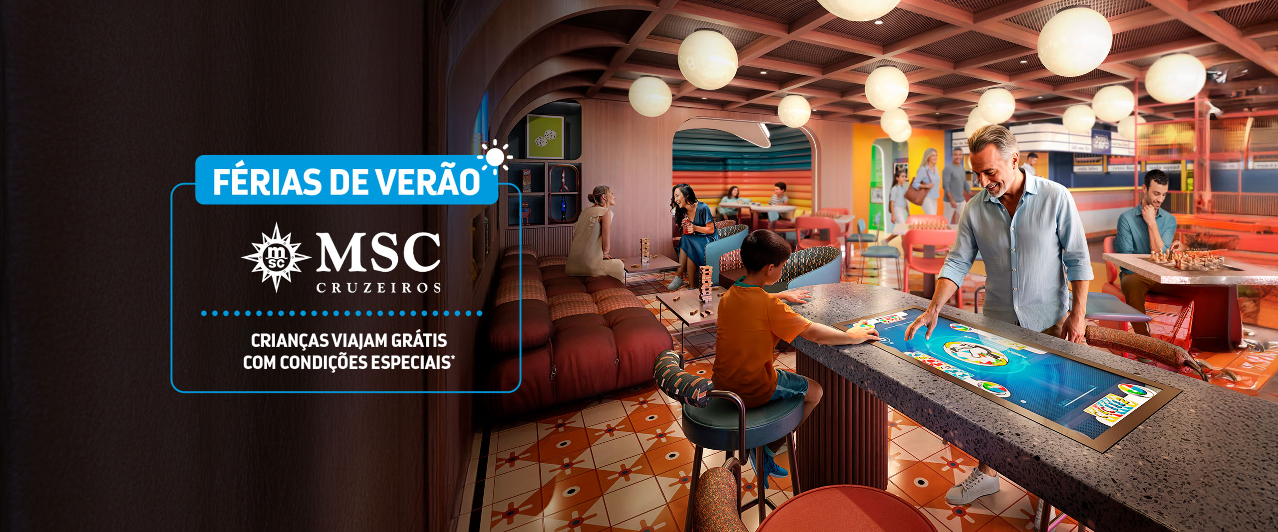 Oferta não cumulativa com outros descontos vigentes, incluindo, mas não se limitando ao MSC Voyagers Club, cupons promocionais, promoções para grupos ou outras campanhas em vigor. Oferta válida para todos os canais. Nessa promoção, o 3º e 4º hóspedes terão que realizar apenas o pagamento das taxas portuárias e de hotelaria, sendo isento o valor da parte marítima. Os valores divulgados estão sujeitos a flutuação cambial e disponibilidade de estoque. A cotação não garante a reserva. A adesão à promoção será efetivada somente mediante confirmação de pagamento. Limitado a 50 cabines por saída.