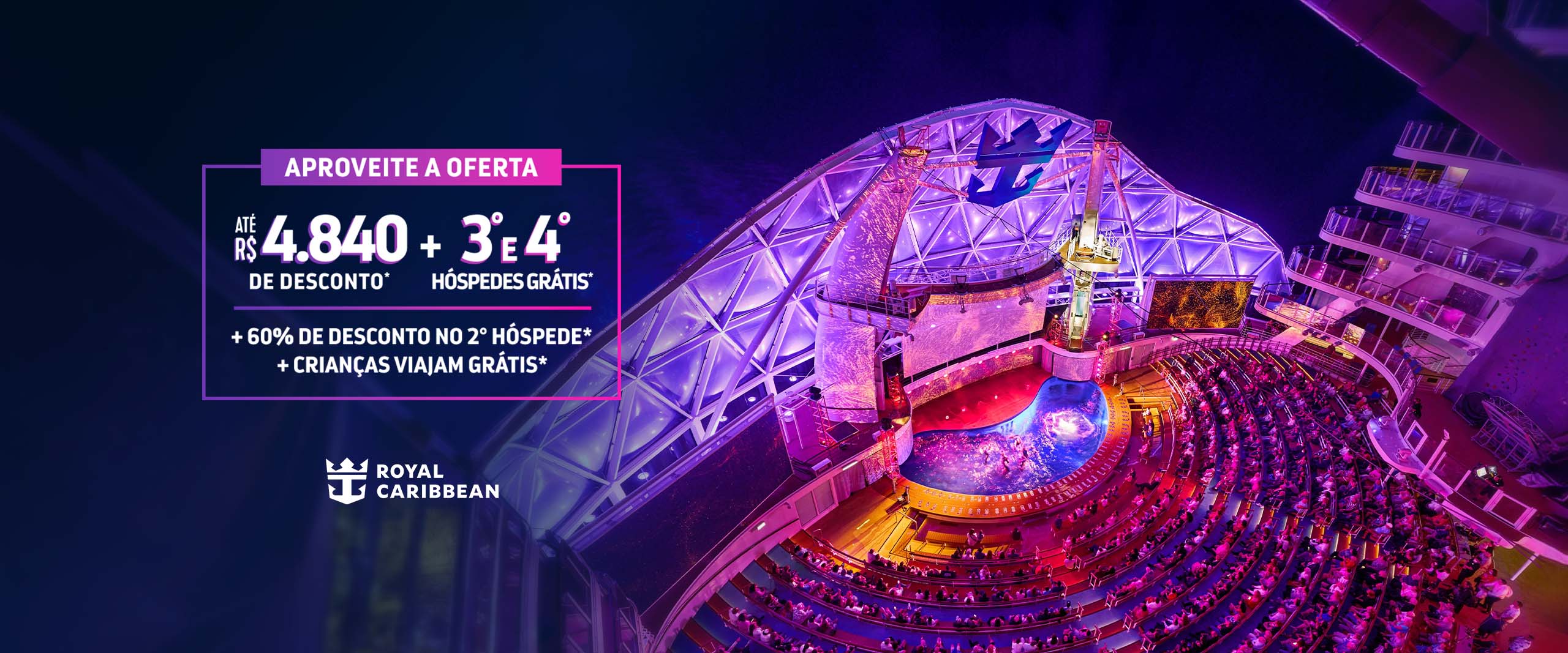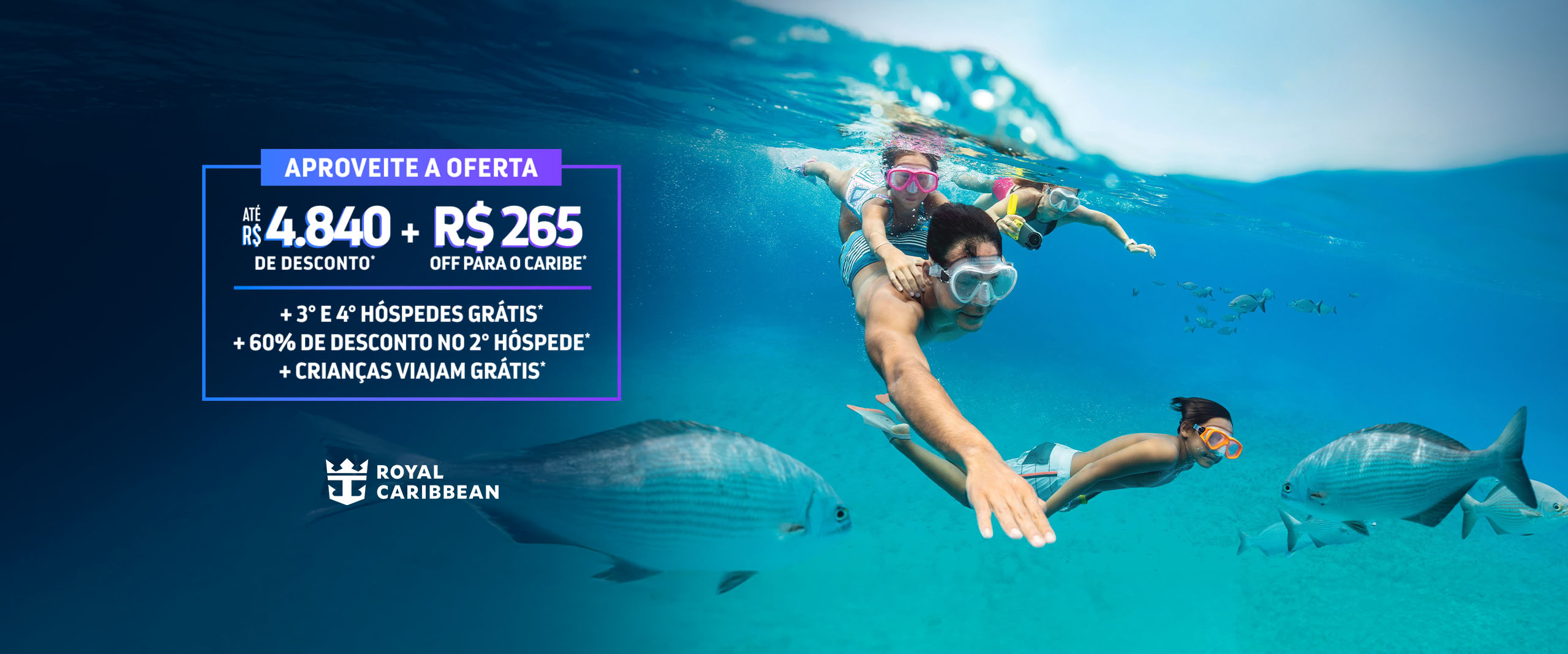 A oferta “3º E 4º HÓSPEDES GRÁTIS”, oferece tarifa do cruzeiro gratuita para 3º e 4º hóspedes com 13 anos completos ou mais até a data de partida do cruzeiro, em saídas de 3 noites ou mais, reservados na mesma cabine que os primeiros dois hóspedes, classificando em uma cabine tripla ou quádrupla. O cruzeiro deve ser reservado entre 02 de janeiro de 2025 e 01 de fevereiro de 2026, com data de embarque entre 03 de janeiro de 2026 e 31 de dezembro de 2026. “3º E 4º HÓSPEDES GRÁTIS”, exclui as saídas entre as datas especiais de Ação de Graças (de 19 de novembro a 27 de novembro de 2026); Fim de ano (de 18 de dezembro de 2025 a 5 de janeiro de 2026; de 17 de dezembro de 2026 a 4 de janeiro de 2027); Primavera (de 6 de março a 9 de abril de 2026); Ovation of the Seas no Ano Novo Chinês (de 15 de fevereiro a 18 de fevereiro de 2026); Alasca (de 15 de maio a 11 de setembro de 2026); Verão (de 21 de maio a 4 de setembro de 2026), excluindo o Harmony of the Seas, com saída em 26 de julho de 2026.