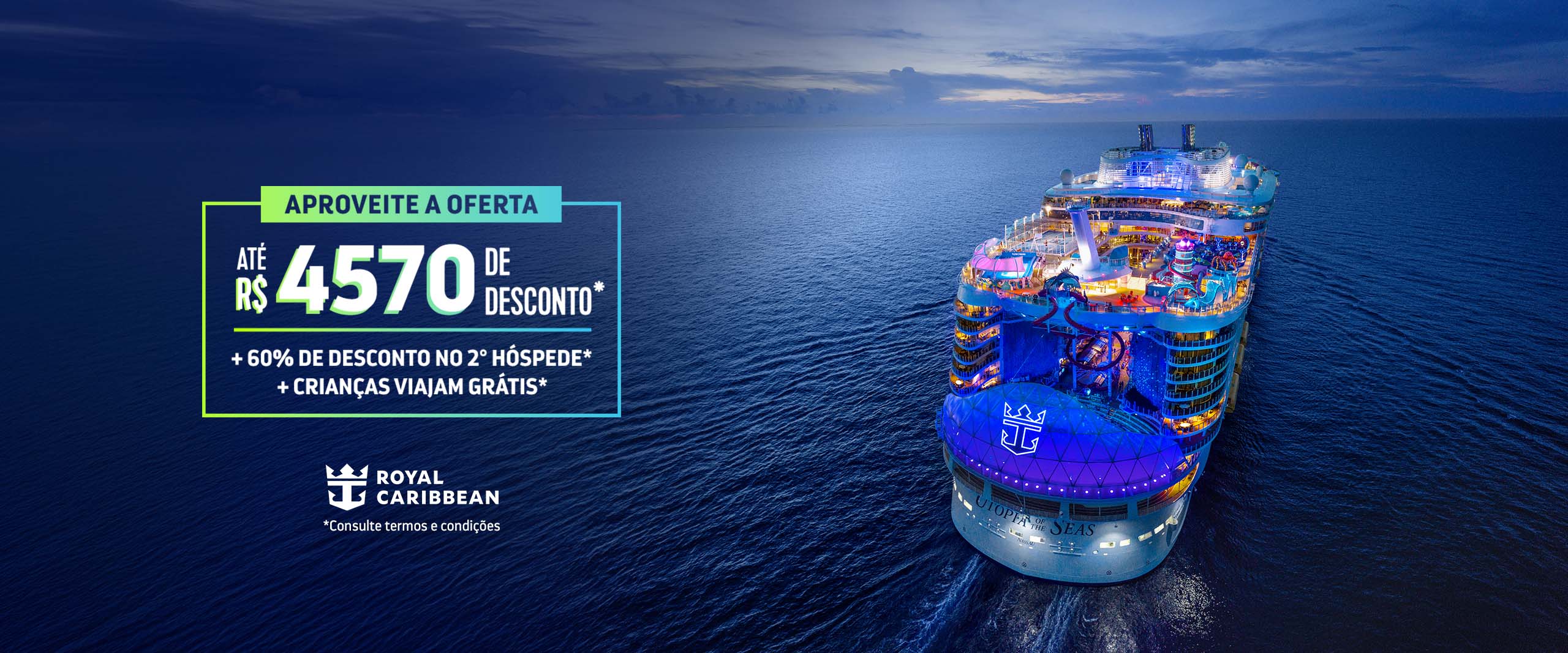 A oferta “FIM DE SEMANA DE DESCONTOS” oferece até R$ 4.570,00 de descontos determinados pela categoria de cabine reservada e pela duração do cruzeiro. Em saídas de 5 noites ou menos, R$ 670,00 de descontos em cabines internas e externas vista mar, R$ 1.075,00 em varandas e R$ 2.150,00 em suítes. Em saídas de 6 noites ou mais, R$ 1.210,00 de descontos em cabines internas e externas vista mar, R$ 1.610,00 em varandas e até R$ 4.570,00 em suítes. O cruzeiro deve ser reservado entre 18 de dezembro a 22 de dezembro de 2025 e a oferta é válida para todas as saídas da Royal Caribbean a partir de 19 de dezembro de 2025. Não aplicável para as saídas da China.